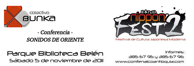 Colectivo Bunka estará participando este sábado 5 de noviembre a las 11:00 a.m. en el Parque Biblioteca Belén (Teatro William Álvarez Veléz), en una magistral conferencia sobre el J-music y su impacto en Colombia, dentro del Nippon Fest II, evento de una semana de duración sobre la cultura nipona en la ciudad de Medellín, Colombia, con la presencia del honorable Embajador de Japón. Cobertura especial en los próximos días. Asiste y no te pierdas esta oportunidad de acercarte un poco más a este milenario país. Infórmate haciendo clic en el enlace activo y mantente sintonizado con el Colectivo Bunka, conectándote con Japón y con Asia. Disponible sólo en español.