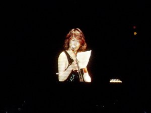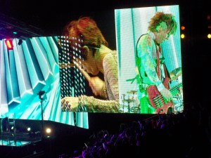 The show had screened landscape technological mixed effects that went along them while playing. It was accompanied by butterflies and a karaoke projection and rehearsal so that everyone sang Anata. They had fireworks, flames and banana stuff by Tetsu, Hyde sent kisses and it seemed to me he almost fell one time when dancing, I cried singing Anata it was so beautiful. Ken read funny stuff from a white piece of paper which included him ¨taking pictures of naked manikins in NY¨, believe me, it was hilarious. There were fireworks, and hits like Ready Steady Go! , Driver’s high, Flower, Honey, and Blurry Eyes were part of the playlist. They also included some of their newer repertoire were we found XXX and Chase, we had Good Luck My Way, My Heart Draws a Dream among others. Ken gave Yuki a bag with souvenirs that he had bought for him in NYC.