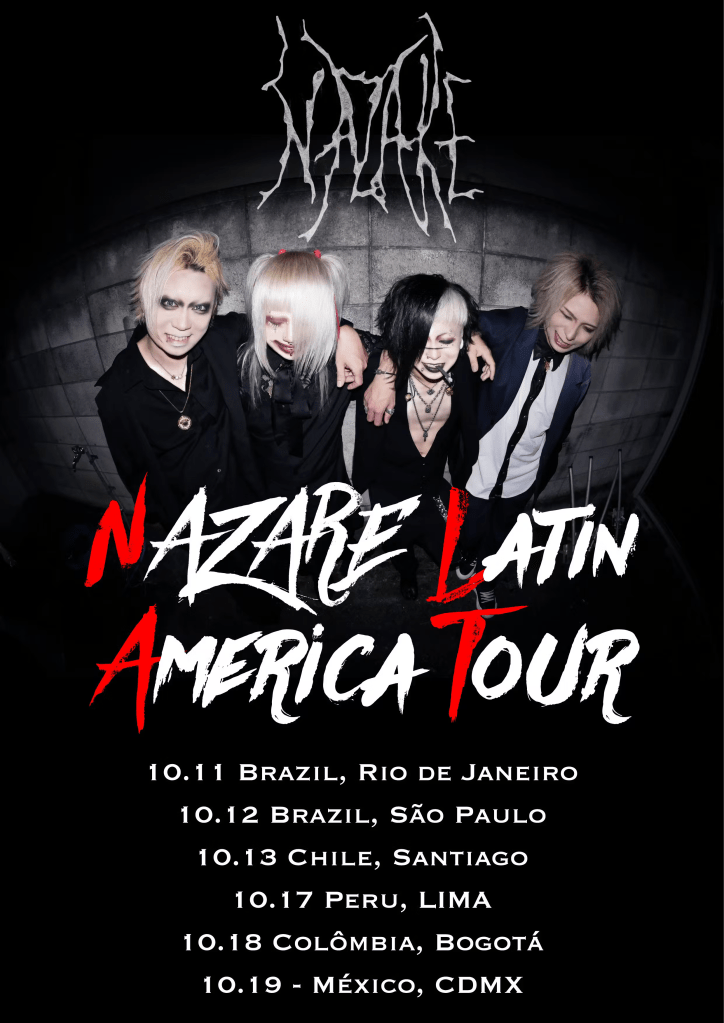 La aclamada banda japonesa NAZARE está emocionada por anunciar su esperada gira por Latinoamérica en octubre de 2024. Con una serie de conciertos programados en algunas de las ciudades más vibrantes de la región, NAZARE promete llevar su característico estilo de rock, visual kei y pop electrónico a nuevos y entusiastas públicos. NAZARE ha sido conocido por sus colaboraciones con otros artistas y bandas dentro de la escena musical japonesa; esto les ha permitido ampliar su alcance y explorar diferentes estilos musicales a lo largo de su carrera.